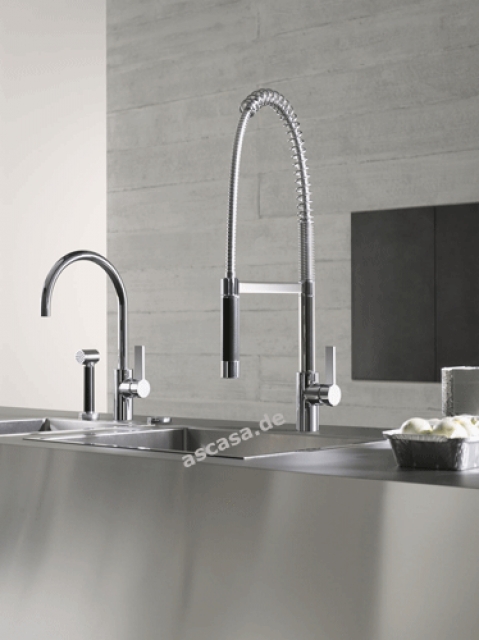 Mit der Profi-Brausegarnitur von Dornbracht verfügen Sie über eine zusätzliche Armatur, mit der Sie vom normalen Auslaufstrahl auf einen Brausestrahl umschalten können. Diese Spiralfederamatur vergrößert dank des Pendelarms den Aktionsradius und erleichtert damit die tägliche Arbeit am wichtigsten Arbeitsplatz in der Küche. Wer mehr Komfort bei der Küchenarbeit wünscht, erhält von der Dornbracht-Profiarmatur somit die perfekte Unterstützung.