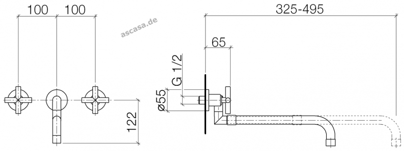 Hingucker sind die beiden Kreuzventile, die je nach Wunsch seitlich rechts oder links neben dem Auslauf an der Wand angebracht werden können. Bei diesem Küchenwasserhahn können Sie zwischen unterschiedlichen Einbauvarianten wählen. Entsprechendes Zubehör für den Unterputz bieten wir von Dornbracht an und muss separat bestellt werden.