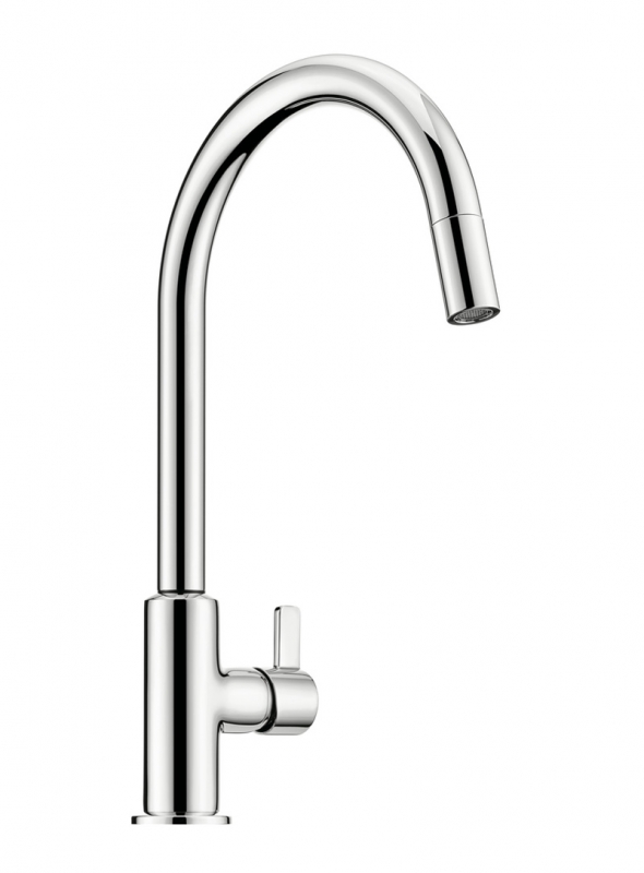 Einhebelmischer. Mit schwenk-/herausziehbarem Auslauf, seitlichem kurzem Hebel, Keramikkartusche und Laminarstrahlregler