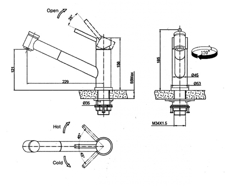 • Schwenkbereich: 120°