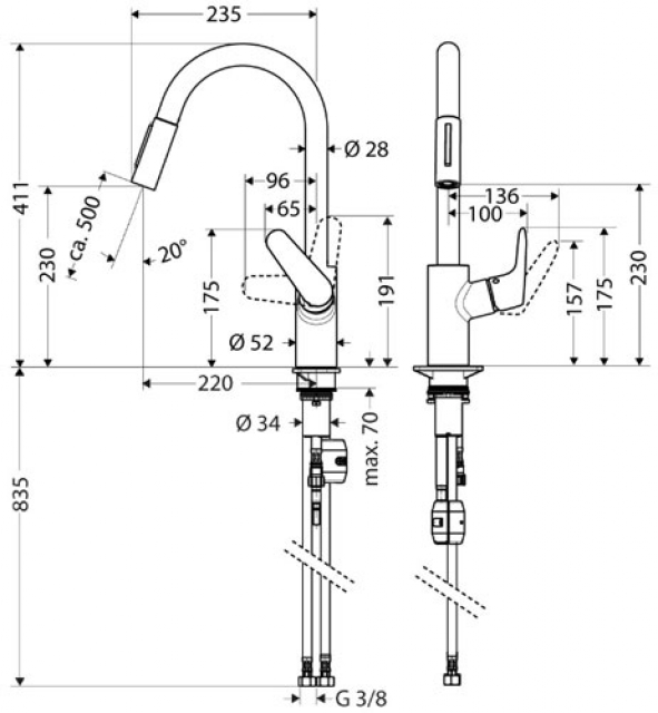 Einhebelmischer mit schwenk-/herausziehbarem Auslauf, seitlichem Hebel und Keramikkartusche