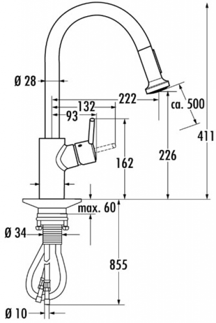 Einhebelmischer mit schwenk-/herausziehbarer Schlauchbrause (Strahl/Brause umstellbar), seitlichem Hebel und Keramikkartusche