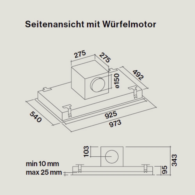 - Mindestabstand vom Kochfeld: 150 cm