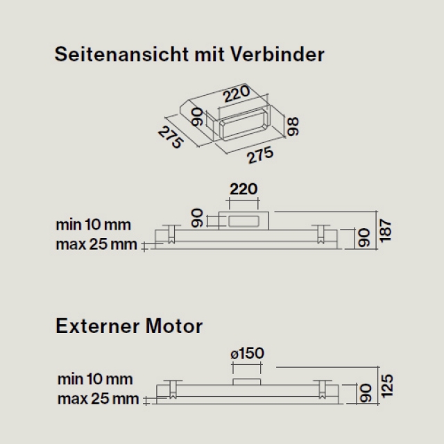 - ACHTUNG: Diese Dunstabzugshaube ist nicht mit einem Motor ausgerüstet, dieser muss separat bestellt werden! Sie finden eine Auswahl an entsprechenden Motoren unter "Sonderzubehör".