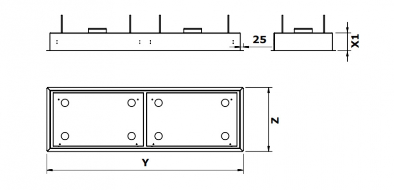 • H (X1) x B (Y) x T (Z): 153 (bei Abgang nach oben) – 253 (Abgang seitlich, vorne oder hinten) x 1650 x 540 mm