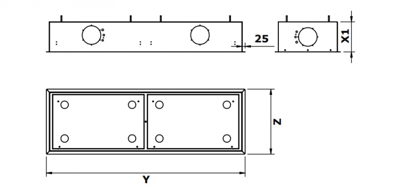 • H (X1) x B (Y) x T (Z): 153 (bei Abgang nach oben) – 253 (Abgang seitlich, vorne oder hinten) x 1850 x 665 mm