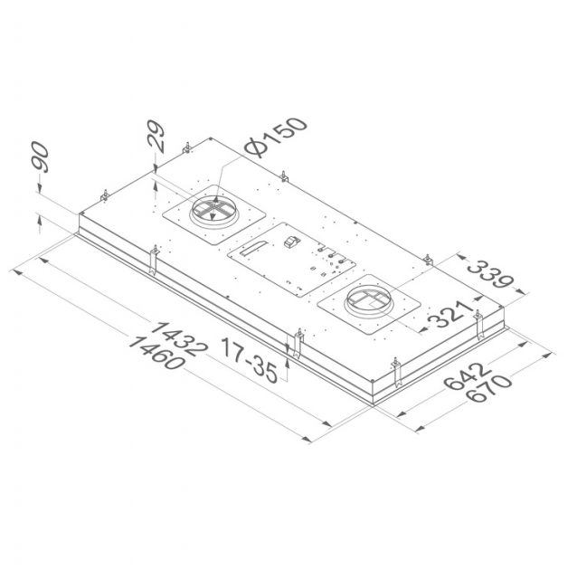 Bei partieller Abhängung empfehlen wir die Planung eines circa 5 cm hohen Wrasenfangraumes. Bei den Trockenbaumaßen muss das trichterförmige Aufsteigen des Kochdunstes mit circa 10