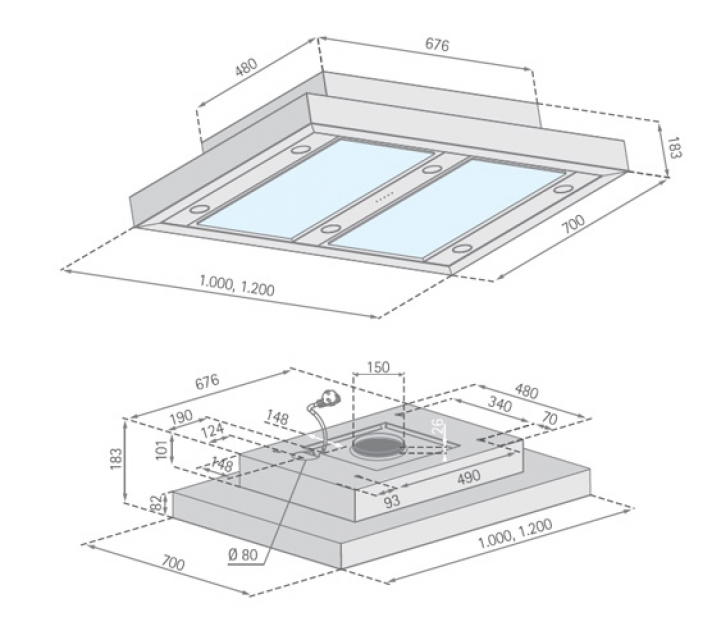 • Gerätemaße: H x B x T: 182 x 1000 x 700 mm (Details siehe Abblidung 2)