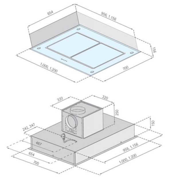 - Nur Abluftbetrieb möglich: Luftauslass in alle Richtungen mit Rundanschluss (150 mm) möglich