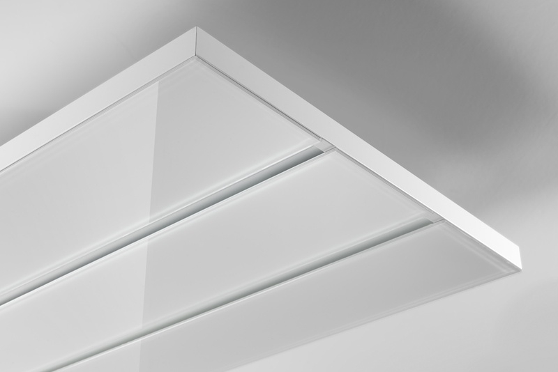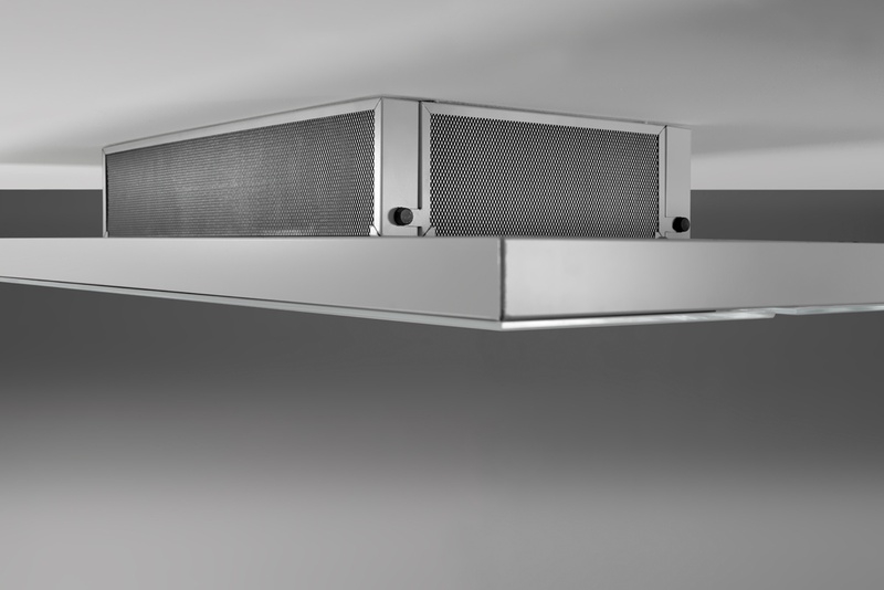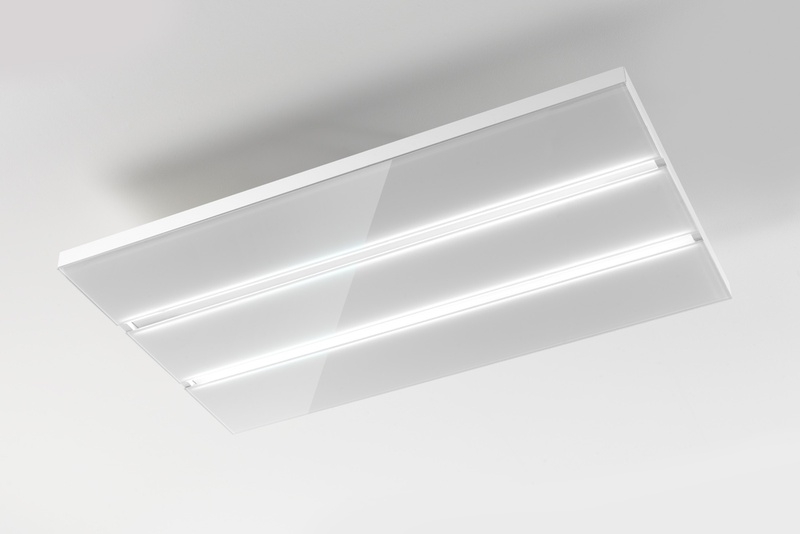 - Deckenlüfter in Edelstahlgehäuse mit Frontpaneel in weiß gefärbten Glas