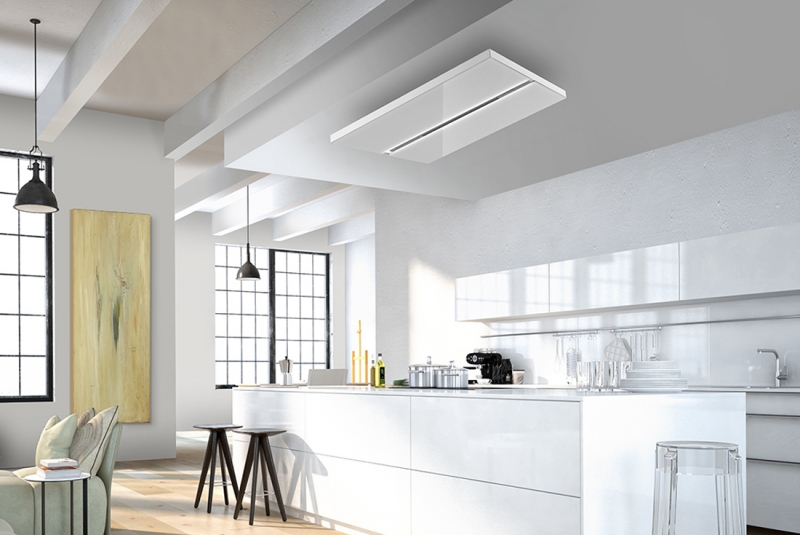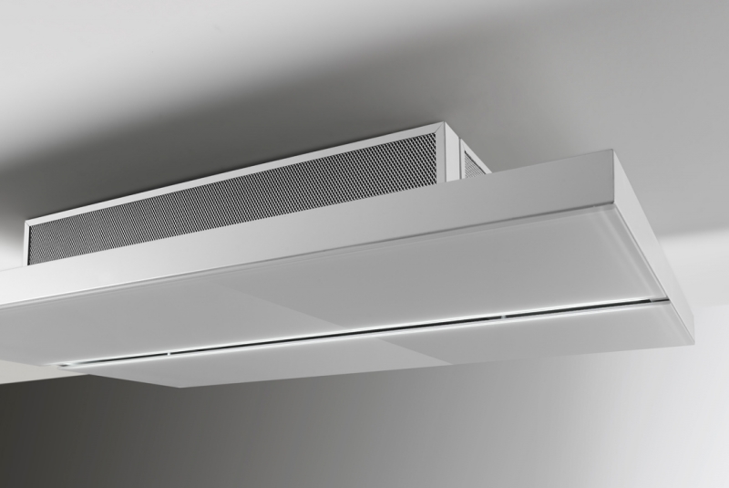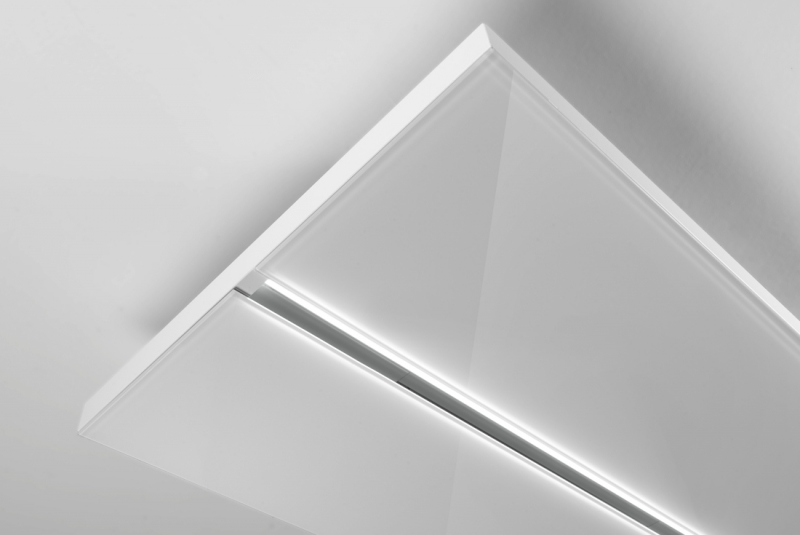 - Deckenlüfter in Edelstahlgehäuse mit Frontpaneel in weiß gefärbten Glas
