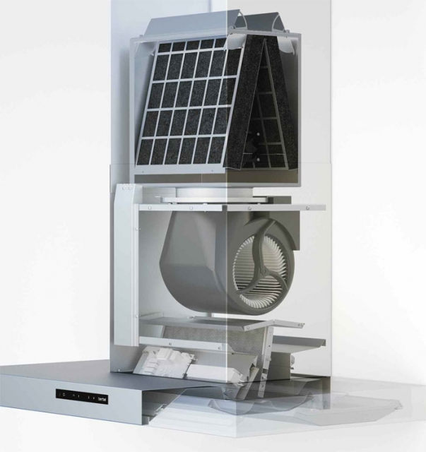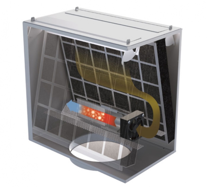In der Regenerationsphase erwärmt die Heizpatrone innerhalb des Katalysators den Kern auf ca. 140°C. Bei Erreichen der Endtemperatur startet der Zirkulationslüfter. Die aus dem Katalysator ausströmende heiße Luft erwärmt den Innenraum des Filters auf ca. 50°C. Diese Temperatur sorgt dafür, dass sich die eingelagerten Geruchsmoleküle aus den Aktivkohlematten lösen und danach durch den Katalysator strömen. Hier werden sie aufgespalten und in CO2 und Sauerstoff umgewandelt. Nach einer Gesamtlaufzeit von ca. 90 Minuten sind sämtliche Geruchsmoleküle aufgespalten und der Filter ist regeneriert. Der Regenerationsprozess kann jederzeit durch das Einschalten der Haube unterbrochen werden.