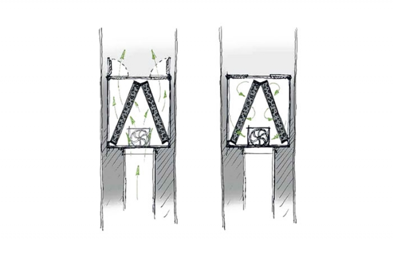 Im Normalbetrieb werden die Filtermatten durchströmt und nehmen die Geruchsstoffe auf. Die Geruchsbindung beträgt dabei 97 %.
