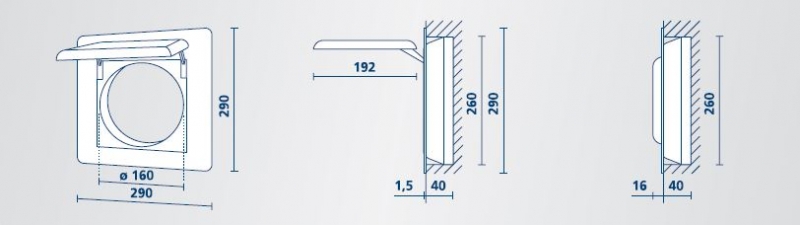 Da der Weibel Mauer-Kasten einfach auf die Wand geschraubt wird, kann er mit jedem beliebigen Rohr-System eingesetzt werden, ohne dass ein Adapter nötig ist. Dabei spielen Form und Abmessungdes Rohres (bis Ø 160) keine Rolle, da der Mauerkasten von Weibel nicht mit dem Rohr in Berührung kommt. Bei Flachkanälen sollte dabei natürlich ein „Übergang von flach auf rund“ mit der runden Seite nach außen in der Wand verbaut werden.