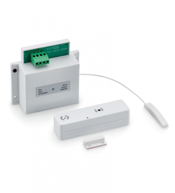 Komplettsystem mit Sender und Empfänger, inkl. Montagematerial und Batterien (lange Lebensdauer, geringer Energieverbrauch).