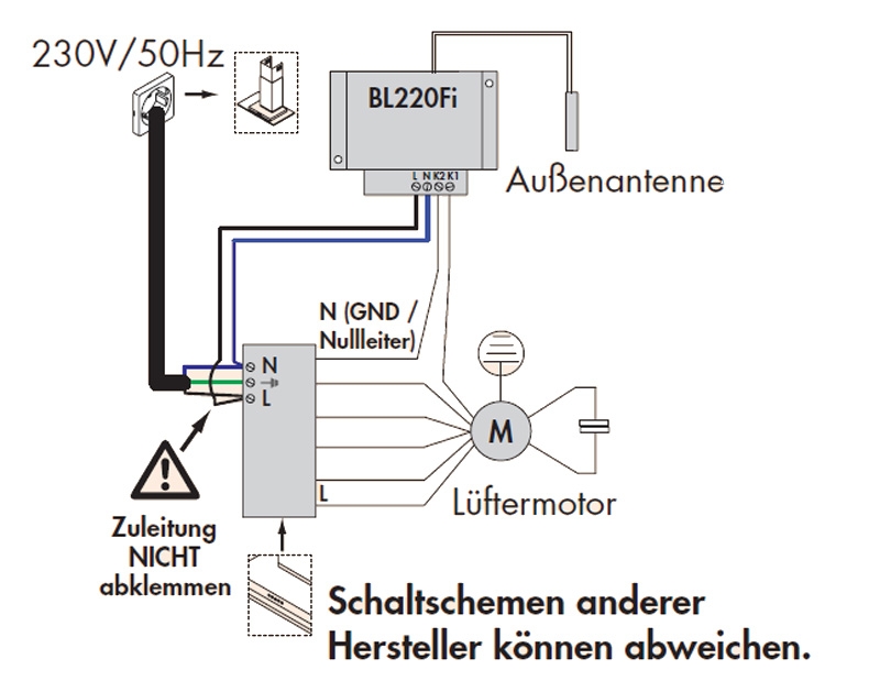 Der Einbau in das Dunstabzugssystem erfolgt über den Anschluss an die Lüftermotor-Zuleitung (Motorzuleitung)
