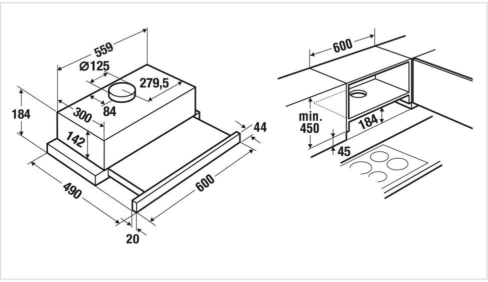 • Gerätemaße: B x H x T ca. 600 x 184 x 300-490 mm
