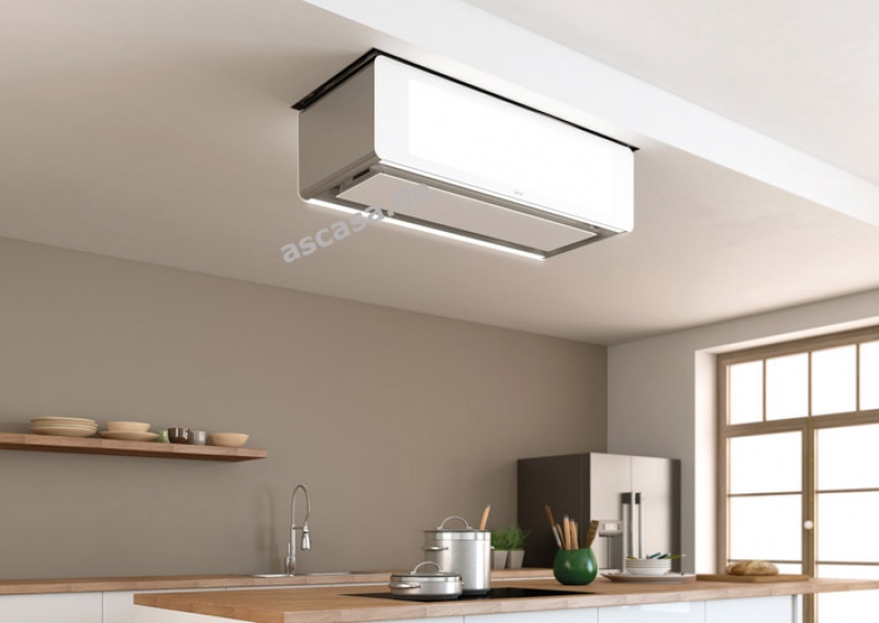 • Seillänge individuell verlängerbar für hohe Räume; Haube schwebt auf Höhe der Seilverlängerung unter der Decke.