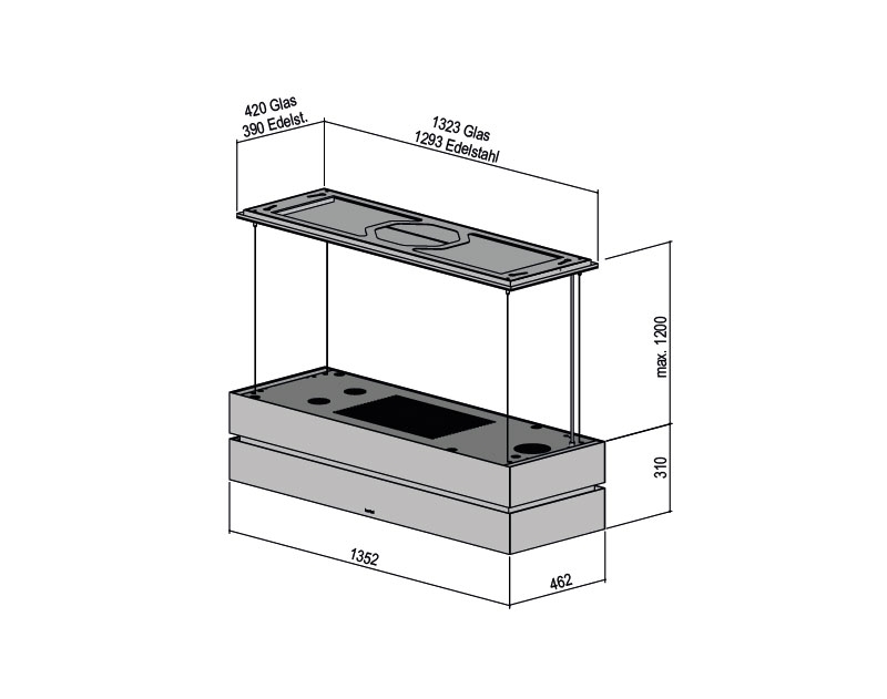 • Seillänge individuell verlängerbar für hohe Räume; Haube schwebt auf Höhe der Seilverlängerung unter der Decke.