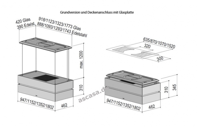 • Seillänge individuell verlängerbar für hohe Räume; Haube schwebt auf Höhe der Seilverlängerung unter der Decke.