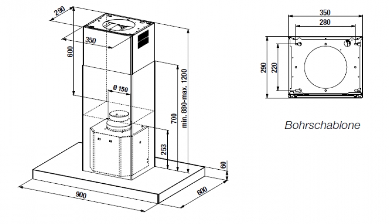 • Mögliche Abmessungen durch Sonderanfertigung: Höhe max. 1150, Höhe min. Abluft 650, Höhe min. Umluft 720
