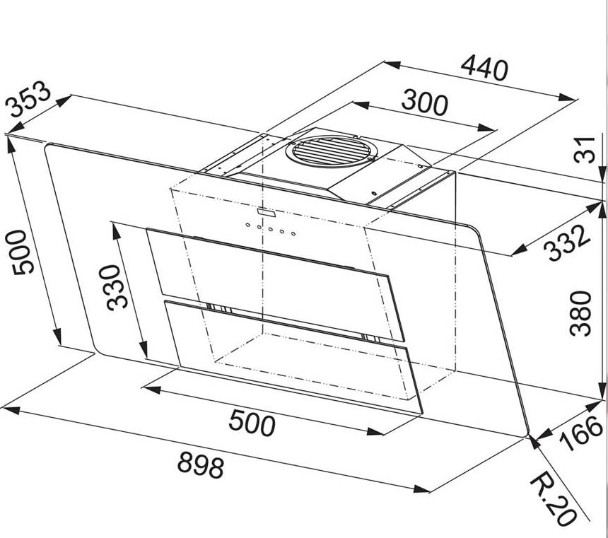 • Sicherheitsabstand zwischen Unterkante Haube und Kochfeld: 40cm