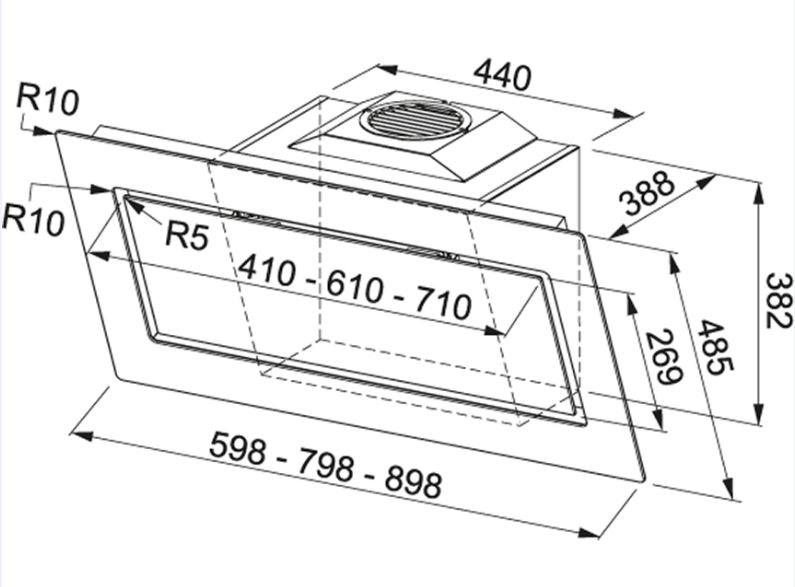 - Sicherheitsabstand zwischen Unterkante Haube und Kochfeld: 40cm