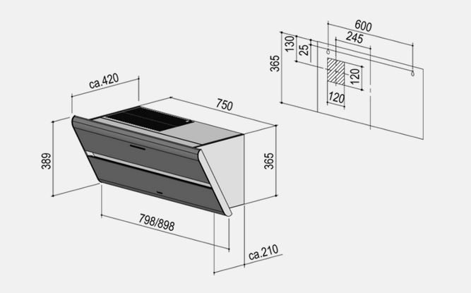• Empf. Abstand zum Kochfeld: 45 cm, bei Gaskochfeld: 65 cm