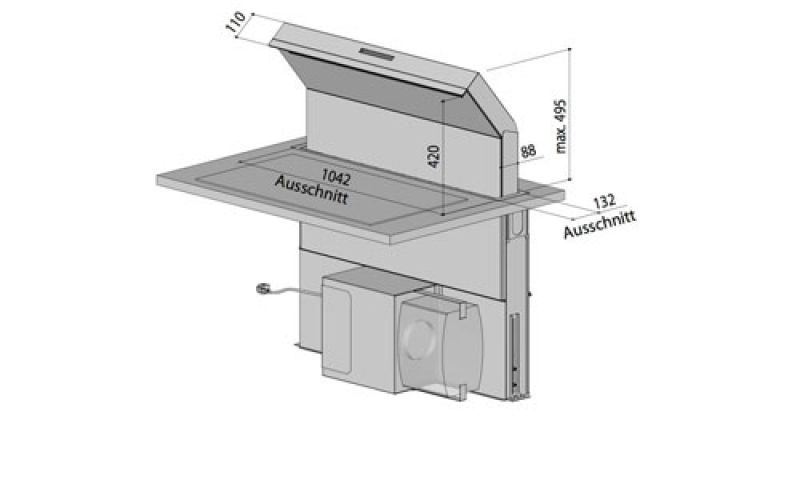 • berbel Moveline Tischlifthaube, Lüfterposition vorne, 1030100: z. B. geeignet für den Einbau hinter dem Schrank (z. B. Umluft). Die Mindesttiefe der Arbeitsplatte liegt bei 80 cm, Kochfeld 48 cm