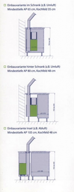• Mindesttiefe Arbeitsplatte: 65 cm (dann nur Panoramakochfeld) oder 80 cm (dann normales Kochfeld 40 cm Tiefe)