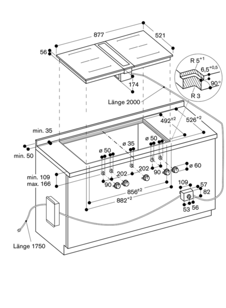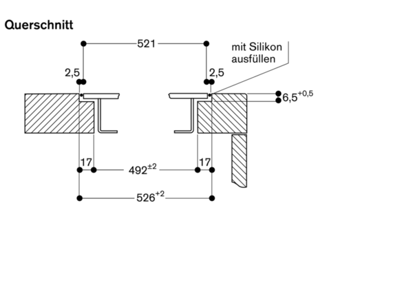 Durch Maßtoleranzen der Glaskeramikscheibe und des Arbeitsplattenausschnittes kann die Fugenbreite variieren.