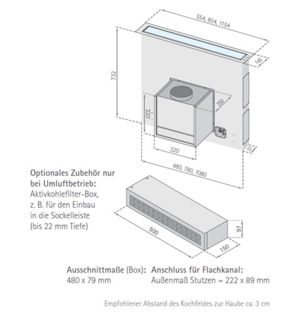 - Für den optimalen Abzug empfehlen wir eine maximale Kochfeldtiefe von 40 cm