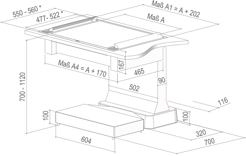 Geeignet für Kochfeldbreite: 547 – 928 mm, Kochfeldtiefe: 477 – 522 mm. Kochfelder mit einer Tiefe unter 477 mm und einer Breite unter 547 mm über Sonderbau.