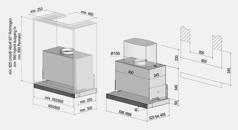 Höhe für Hybridtechnik EcoSwitch: min. 660 mm bei Einsatz von BHF 150+h / min. 830 mm bei BHF und 90° Bogen