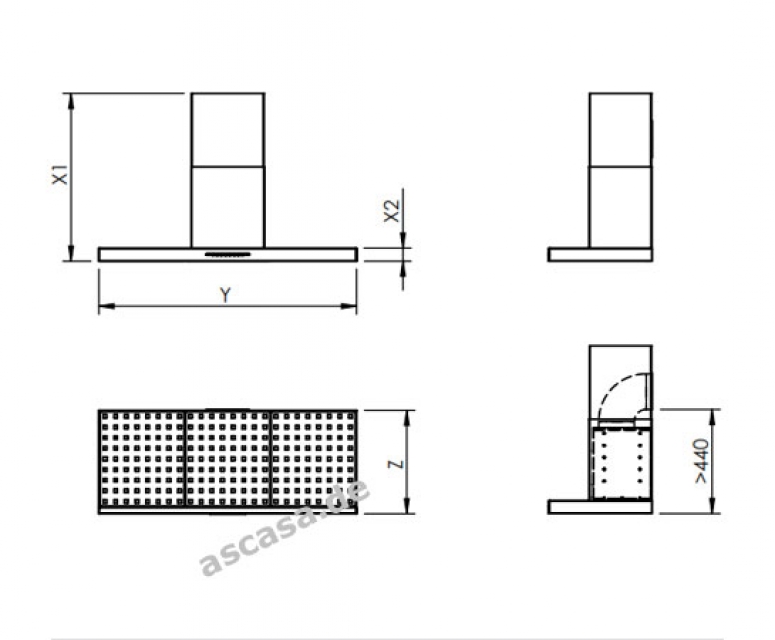 • FlächenabsaugungDer beim Kochvorgang entstehende Wrasen wird flächig, d.h. an allen vorhandenen Seiten, abgesaugt. Diese Absaugungstechnik ist insbesondere bei schwadenvolumigen Geräten angeraten.