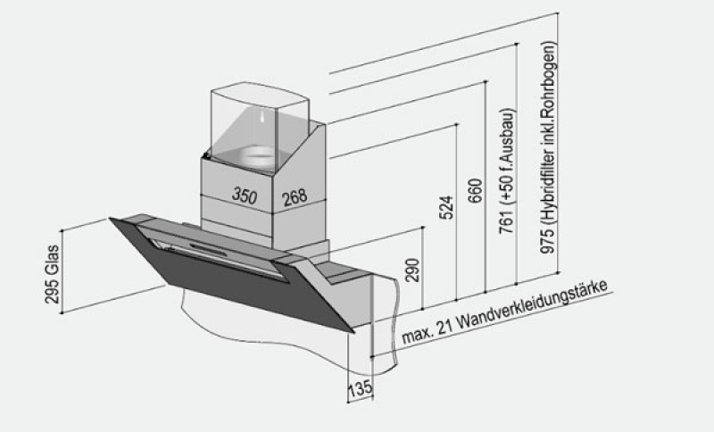 • Max. Nischenrückwandstärke 21 mm bei bündigem Anschluss unter der Haube