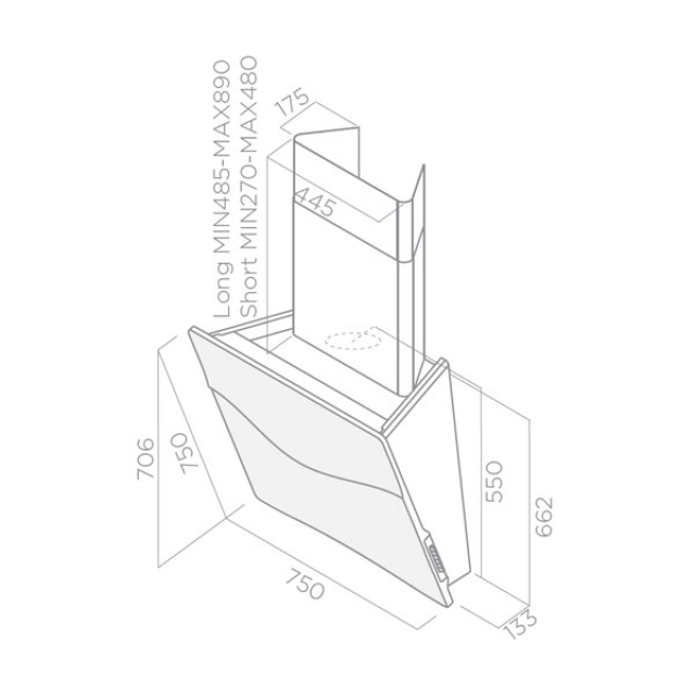In diesem Fall wird die Abzugshaube an ein in der Wand verlegtes Rohr zur Ableitung von Rauch und Küchendünsten angeschlossen. Der innovative zweite Luftaustritt an der Rückseite ermöglicht eine Abluftversion ohne sichtbare Rohrführung.