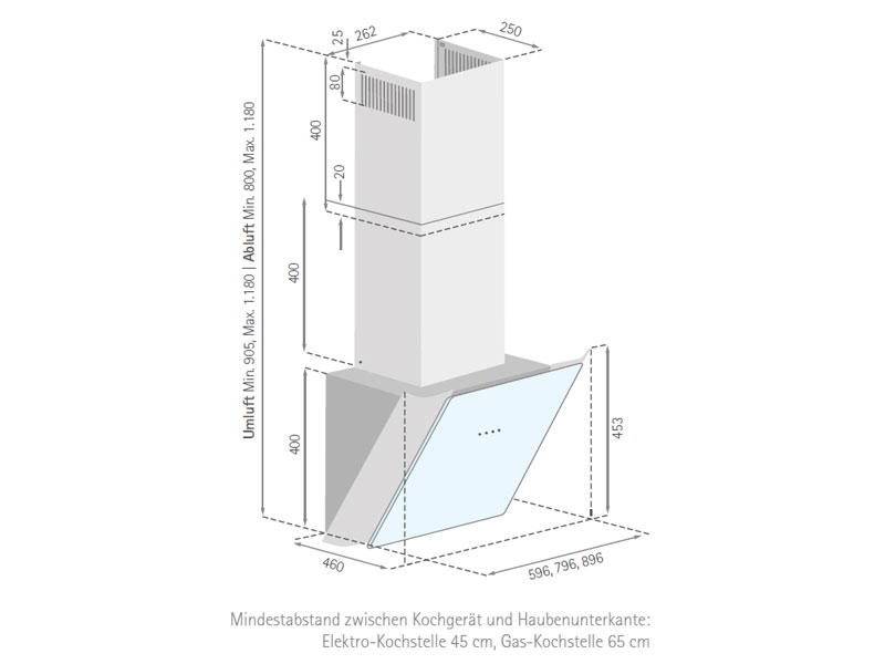• Mindestabstand zwischen Kochgerät und Haubenunterkante: Elektro-Kochstelle 45 cm, Gas-Kochstelle 65 cm