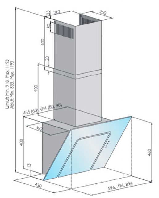 •   Mindestabstand zwischen Kochgerät und Haubenunterkante: Elektro-Kochstelle 45 cm, Gas-Kochstelle 65 cm