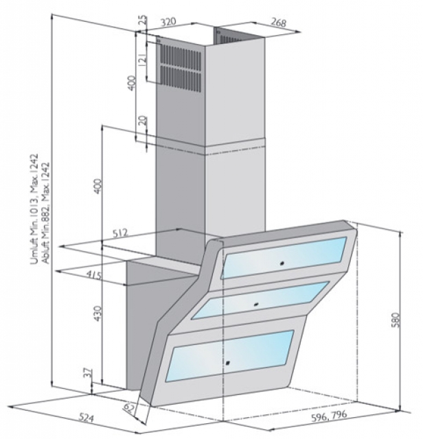 • Mindestabstand zwischen Kochgerät und Haubenunterkante: Elektro-Kochstelle 45 cm, Gas-Kochstelle 65 cm