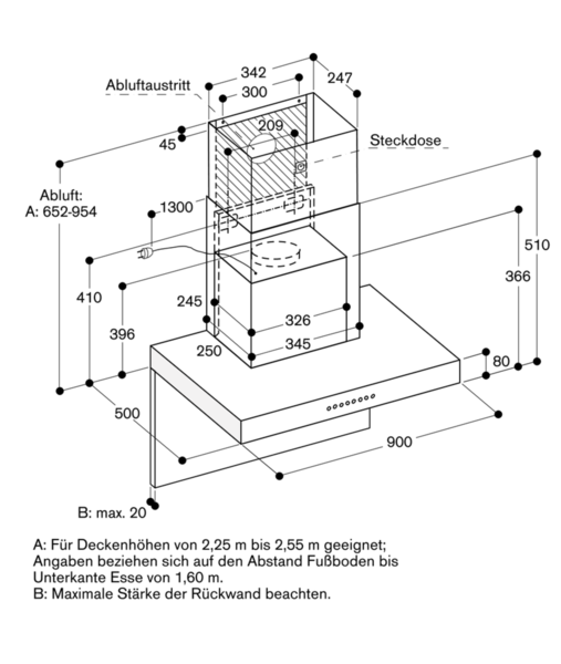 - Abstand über Gasgeräten mind. 65 cm (über 12 kW Gesamtleistung Gas mind. 70 cm)