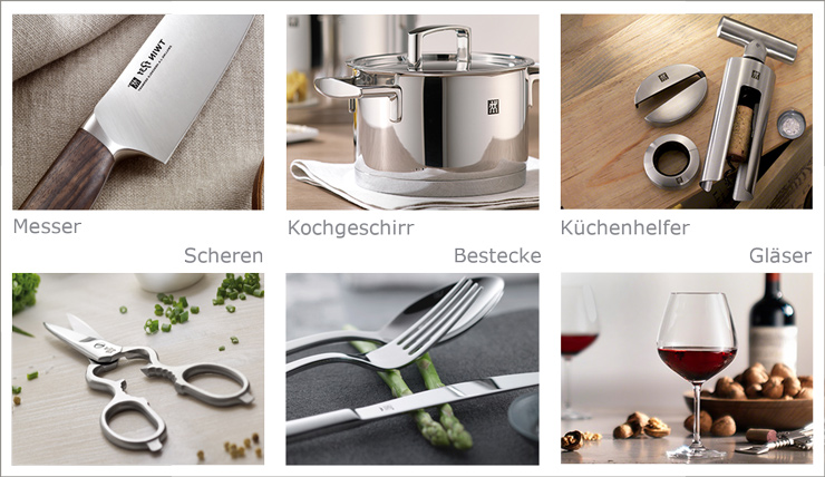 Das Sortiment von Zwilling umfaßt Messer und Messersets, Kochgeschirr (Kochtöpfe, Pfannen, Topfsets), Küchenhelfer wie Rühr- und Schneebesen, Messer, usw.), Scheren, Bestecke und Gläser.