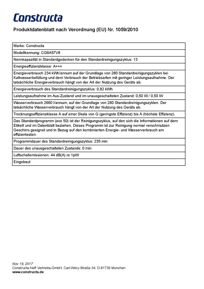 Die Angaben im Datenblatt beziehen sich auf das Programm Eco 50 °C. Dieses Programm ist zur Reinigung normal verschmutzten Geschirrs geeignet und in Bezug auf den kombinierten Energie- und Wasserverbrauch am effizientesten