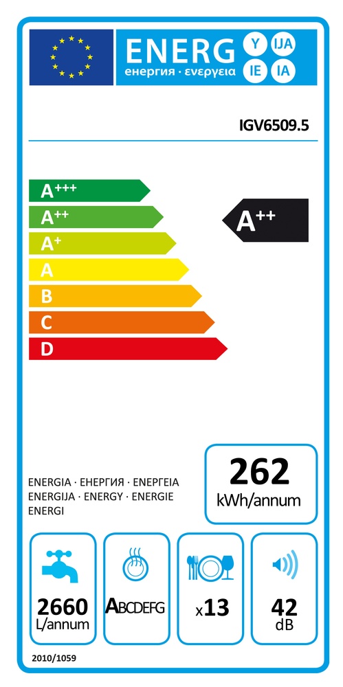 • Energieverbrauch 262 kWh / Jahr auf der Grundlage von 280 Standardreinigungszyklen bei Kaltwasserbefüllung und dem Verbrauch der Betriebsarten mit geringer Leistungsaufnahme. Der tatsächliche Energieverbauch hängt von der Art der Nutzung des Gerätes ab.