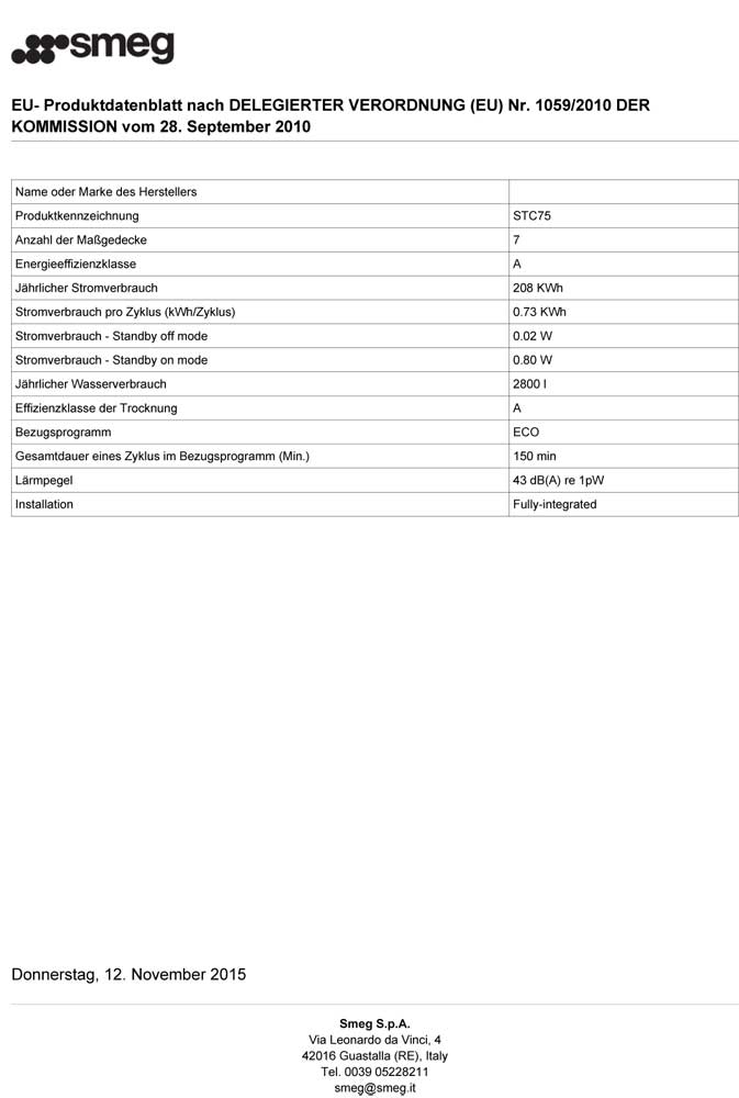 Technische Daten der Smeg Spülmaschine STC 7 5: