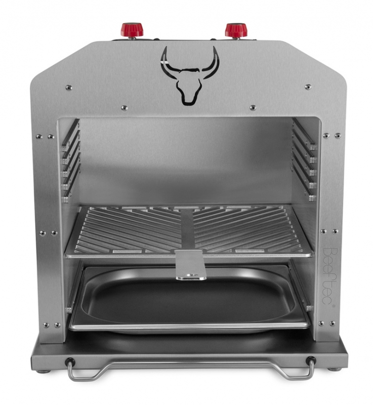 Durch eine extrem hohe Grilltemperatur des neu entwickelten Gasgrills der Firma Beeftec® von bis zu 830°C, die durch einen Keramikbrenner erzeugt wird, entsteht ein neues, einmaliges Grillerlebnis. Die hohe Temperatur sorgt dafür, dass das Fleisch innerhalb kürzester Zeit seine Struktur verändert, wodurch weniger Fleischsäfte austreten können. Durch den oben liegenden Keramikbrenner enstehen zudem keine giftigen Dämpfe. Die beiden Brenner können unabhängig voneinander hinsichtlich der Leistung gere
