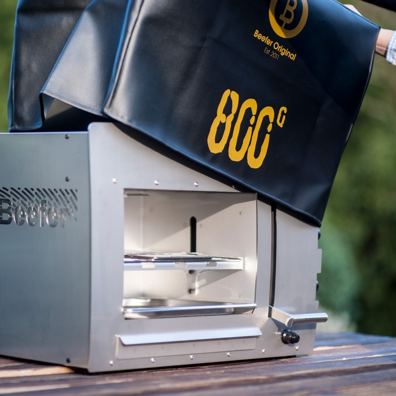 Die Arbeitstemperatur von 800°C. Diese wird bisher von keinem anderen Gerät erreicht, bzw. allenfalls von Profigeräten, die sehr, sehr groß, als auch schwer sind und deutlich teurer sind. Ein hochwertiger konventioneller Gasgrill erreicht unter optimalen Bedingungen maximal 400°C. Preiswertere Modelle meist aber noch weniger. Dabei besitzt der Beefer sehr geringe Außenabmessungen und ist sehr leicht zu bedienen.