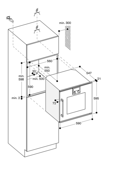- Für Einbau unter Kochfelder: Abstand zwischen Kochfeld-Unterseite und Oberkante des Backofengehäuses: min. 15 mm