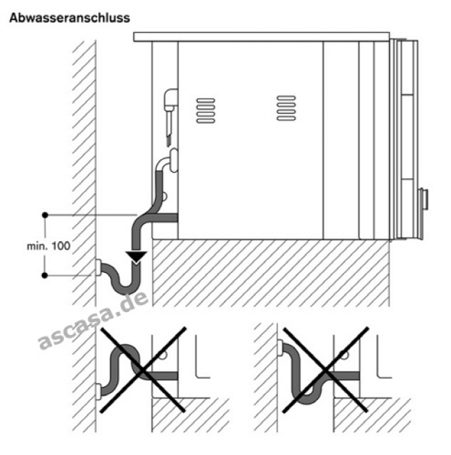 • Ablaufschlauch an keiner Stelle höher als Geräteunterkante positionieren und mind. 100 mm tiefer als Geräteablauf (s. Abbildung Abwasseranschluss).