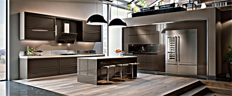 • Schwarzglasfront mit Profilleisten in Kupfer